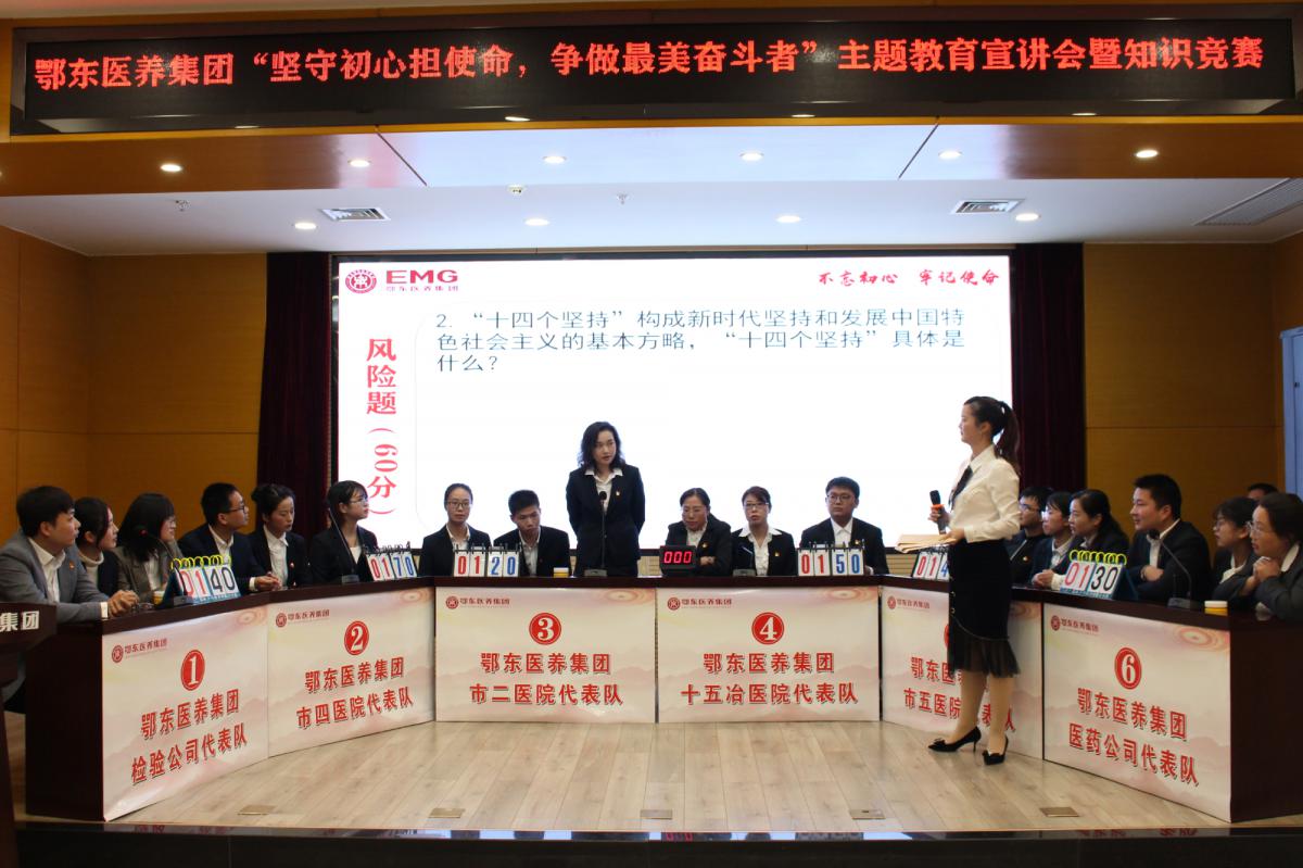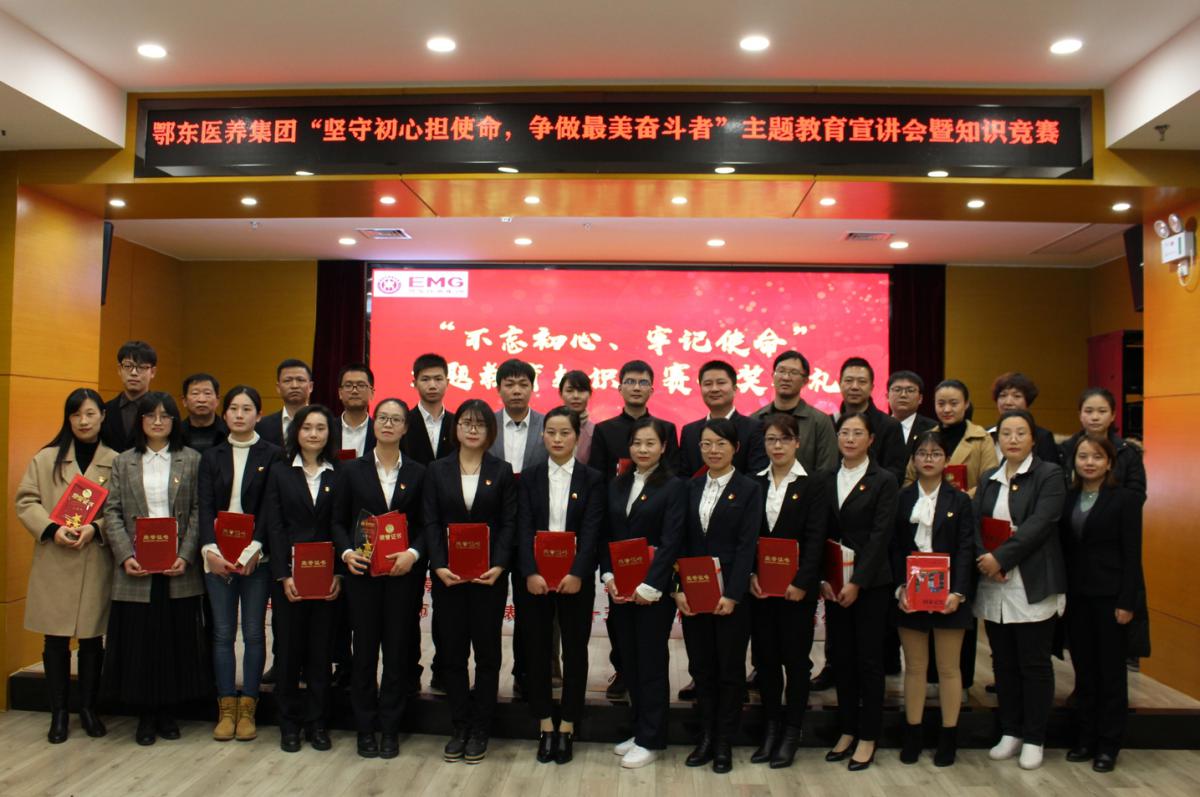 為推動(dòng)“不忘初心、牢記使命”主題教育走深走實(shí)走心,11月26日下午,鄂東醫(yī)養(yǎng)集團(tuán)舉辦“堅(jiān)守初心擔(dān)使命,爭(zhēng)做最美奮斗者”主題教育宣講會(huì)暨知識(shí)競(jìng)賽活動(dòng)。市城發(fā)集團(tuán)黨委委員、副總經(jīng)理、醫(yī)養(yǎng)集團(tuán)黨委書記余福安,醫(yī)養(yǎng)集團(tuán)黨委副書記、董事長(zhǎng)、總經(jīng)理李京鶴參加活動(dòng)并為獲獎(jiǎng)選手頒獎(jiǎng)。醫(yī)養(yǎng)集團(tuán)及各直屬單位班子成員、基層黨支部書記、相關(guān)部門負(fù)責(zé)人、黨員代表共100余人參加活動(dòng),積極營(yíng)造主題教育學(xué)先進(jìn)、爭(zhēng)先進(jìn)的濃厚氛圍。