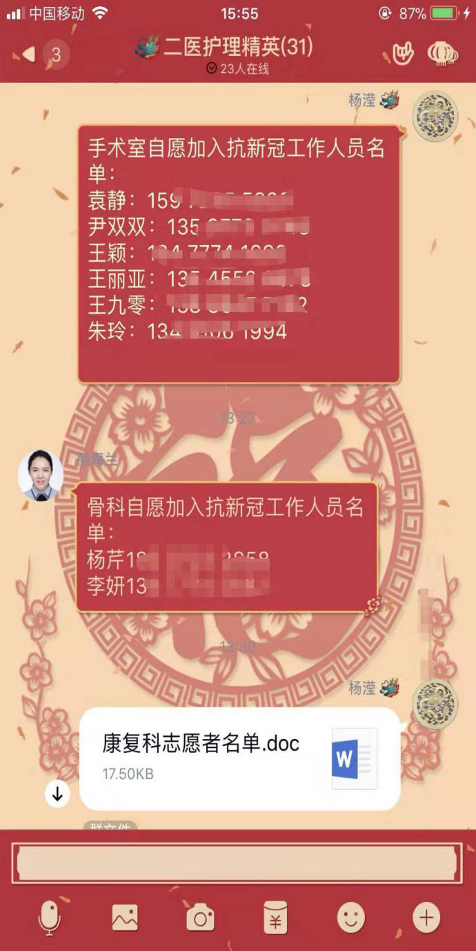 醫(yī)養(yǎng)集團(tuán)工作群里黨員干部職工報(bào)名志愿者接龍,
