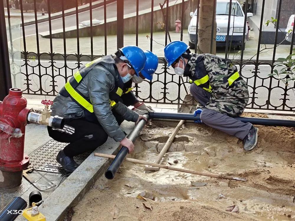 在抗擊疫情特殊時(shí)期,公司克服材料采購(gòu)、車輛調(diào)度、人員安排等困難,特事特辦,當(dāng)天便迅速安排公司客服中心、設(shè)計(jì)公司以及建設(shè)工程公司相關(guān)負(fù)責(zé)人趕赴現(xiàn)場(chǎng),進(jìn)行勘測(cè)設(shè)計(jì)、制定方案并組織材料施工,僅5小時(shí)便完成外部供水管道敷設(shè),具備了通水條件。