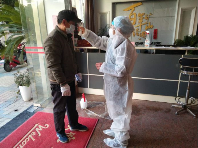 四醫(yī)院冶礦路社區(qū)康養(yǎng)中心華杉正在給下班回賓館的醫(yī)務人員消毒