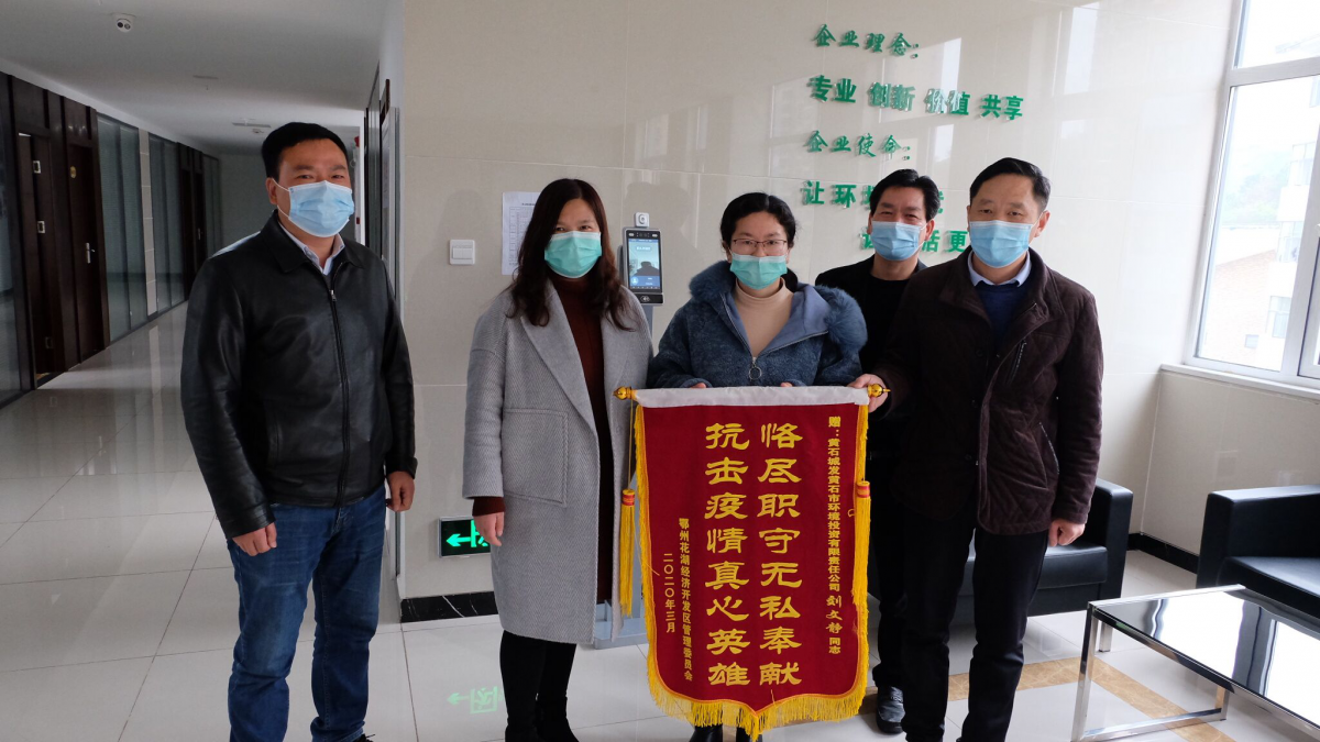 2020年3月31日上午,鄂州花湖經(jīng)濟開發(fā)區(qū)管理委員會工作人員專程來到環(huán)投公司,將寫著“恪盡職守無私奉獻、抗擊疫情真心英雄”的感謝錦旗送到公司財務(wù)融資部劉文靜手中,感謝她在疫情期間對花湖鎮(zhèn)站前社區(qū)疫情防控工作做出的貢獻。