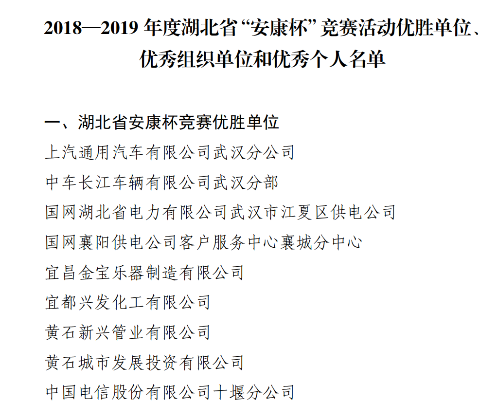 湖北省“安康杯”競(jìng)賽由湖北省總工會(huì)、湖北省應(yīng)急管理廳聯(lián)合主辦。“安康杯”競(jìng)賽考核標(biāo)準(zhǔn)依據(jù)各行業(yè)的安全生產(chǎn)管理特點(diǎn)、傷亡事故和職業(yè)病控制水平等綜合因素制定,通過競(jìng)賽考核參賽企業(yè)的安全生產(chǎn)管理、領(lǐng)導(dǎo)者安全生產(chǎn)意識(shí)、職工安全生產(chǎn)知識(shí)水平和能力、安全生產(chǎn)等各項(xiàng)指標(biāo)。2018—2019年度共評(píng)出58個(gè)優(yōu)勝單位、30個(gè)優(yōu)秀組織單位、40名優(yōu)秀個(gè)人。