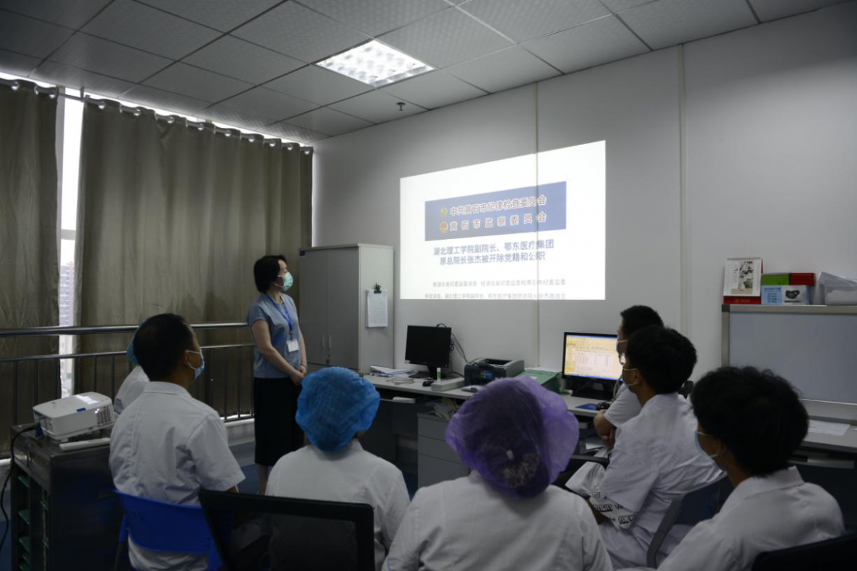 廉政警示教育進科室。進醫(yī)院臨床科室講解已查處的違紀(jì)違法典型案例,再敲“警示鐘”、繃緊“廉政弦”、注射“免疫針”。