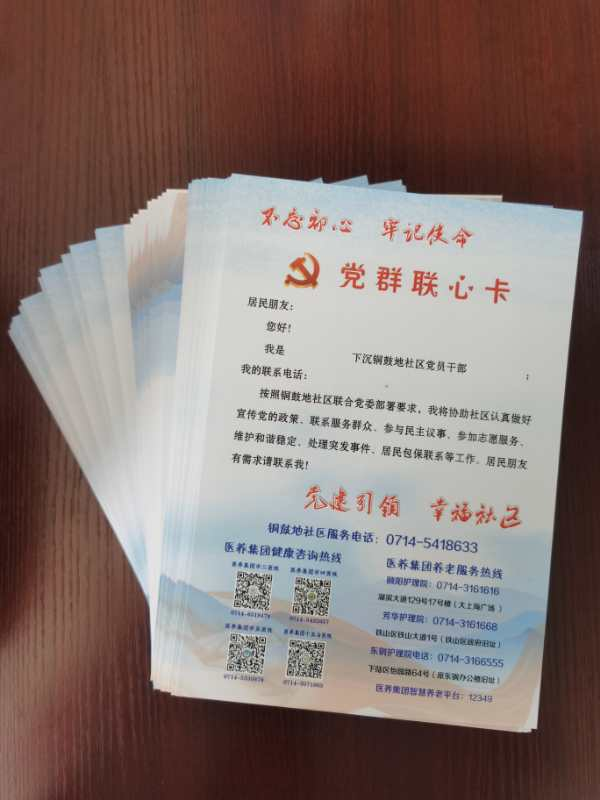 李京鶴表示,此次發(fā)放“黨群聯(lián)心卡”是下沉黨員干部入戶(hù)宣傳的一種有效措施。鄂東醫(yī)養(yǎng)集團(tuán)聯(lián)系社區(qū)工作隊(duì)精心制作的“黨群聯(lián)心卡”,靈活解讀下沉社區(qū)工作任務(wù),讓居民更深入了解政策,建立起便捷的溝通橋梁,有利于更好發(fā)揮網(wǎng)格化管理作用,在居民需要幫助的時(shí)候能夠及時(shí)聯(lián)系到社區(qū)下沉黨員干部。同時(shí),結(jié)合醫(yī)養(yǎng)集團(tuán)醫(yī)療養(yǎng)老資源優(yōu)勢(shì)和社區(qū)老年群體較多的特點(diǎn),將醫(yī)養(yǎng)集團(tuán)各直屬醫(yī)院、養(yǎng)老服務(wù)機(jī)構(gòu)健康熱線進(jìn)行了公布,用心用情提升入戶(hù)結(jié)對(duì)成效。