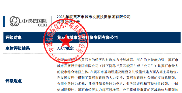 中誠信國際信用評級有限責任公司確定黃石城發(fā)集團主體長期信用等級為AA+,評級展望為穩(wěn)定。黃石城發(fā)集團是黃石地區(qū)目前唯一一家,也是湖北省內(nèi)繼宜昌、襄陽、荊州后,第四個地級市中榮獲中誠信評級公司AA+主體信用等級的國有企業(yè)。